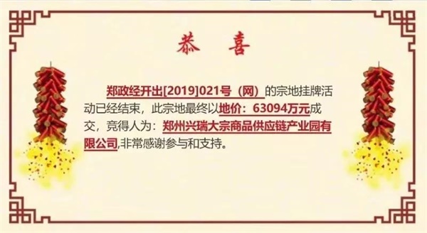 成交價(jià)格63094萬元,溢價(jià)率2.6%,成交畝單價(jià)874萬元/畝,成交樓面價(jià)3744元/㎡,最終由鄭州興瑞大宗商品供應(yīng)鏈產(chǎn)業(yè)園有限公司競(jìng)得。