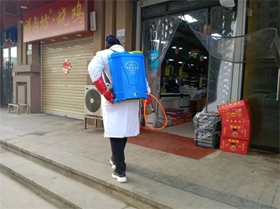 每天與太陽齊肩并行,到崗后的第一件事:配比稀釋大量消毒物料,接著任由吸盤一樣的大號消毒藥桶鑲嵌在后背上,壓著她的背有些駝,就算是年輕人的背,也不一定能承受得了這每天都幾十斤消毒水的重量。