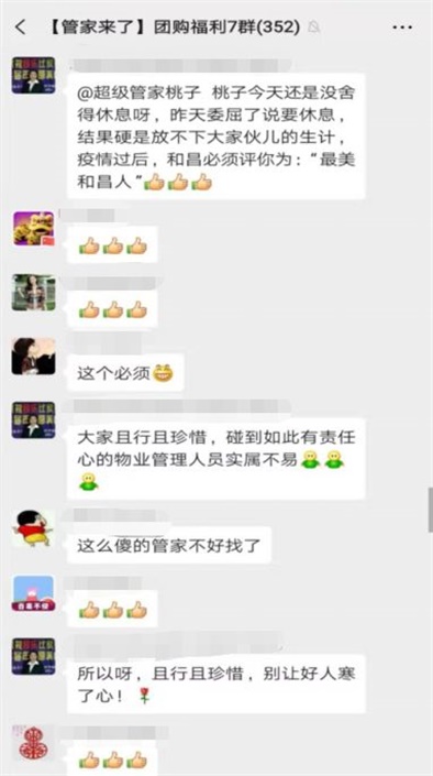 后來看到群里大家的發(fā)言,善良又熱心的陳雪感動了,群里的業(yè)主都紛紛站出來為她說話,替她抱不平,他們細數(shù)著陳雪每天的艱辛和不易,還有業(yè)主默默的發(fā)紅包安慰她,紅包她拒收了,收獲的感動卻是滿滿的。那一刻她還是決定了為了這么多理解和支持她工作的業(yè)主們,不管接下來工作量有多大,加班到多晚,也要努力的幫大家找一些生活必需品。