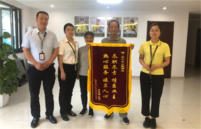 這個(gè)事情讓業(yè)主大為感動(dòng),非要感謝她,董大姐多次推脫表示這是她力所能及的事情,以后有事盡管找她幫忙就行。業(yè)主就悄悄的做了一面錦旗送到了崗位,親切的拉住董大姐的手再次表示感激!