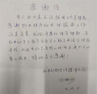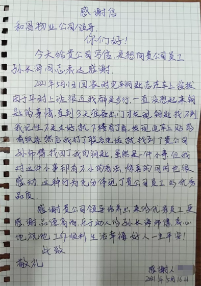 勞動(dòng)節(jié)前的一個(gè)晚上,一位業(yè)主家的兒子突然身體不適,大爺不會(huì)使用手機(jī)叫車(chē)求助到門(mén)崗,門(mén)崗值班員肖瑞濤了解情況后立馬用自己的手機(jī)叫車(chē),并支付了車(chē)費(fèi)。為感謝秩序伙伴在緊急時(shí)刻及時(shí)伸出援手,雪中送炭,業(yè)主特意到物業(yè)前臺(tái)送來(lái)錦旗一面,表示感謝。
